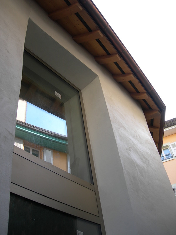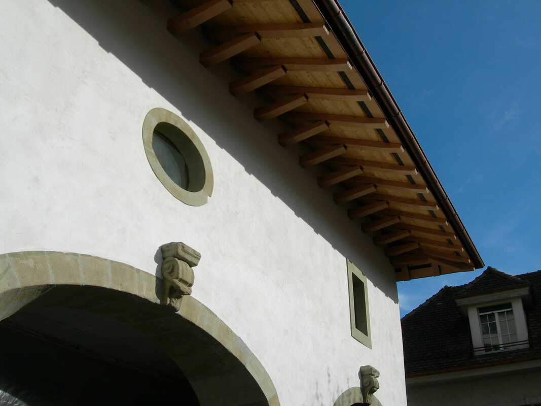 La charpente de cette bâtisse d’époque a été intégralement démontée, mais en préservant les fermes existantes selon les directives des monuments historiques. Reconstruction à neuf de la charpente avec intégration des fermes d’origine. La couverture est réalisée en tuile plate coupe pointue, cannelée à l’ancienne 17/39cm (Gasser Ceramic) nuancé jaune. Les ferblanteries en zinc-titane sont réalisées par nos soins et le choix des fenêtres de toiture s’est porté sur des fenêtres Stebler s :203.