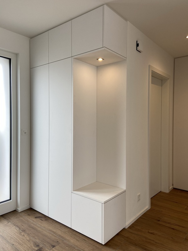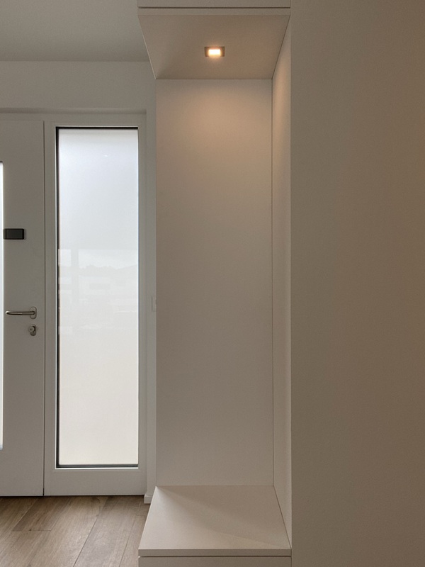 Création de nouveaux agencements dans une villa familiale : – Vestiaire et armoires murales en finition Egger PerfectSense W 1100 PM/ST9 Matt – Dressing ouvert en finition SwissKrono U3188 VL truffe