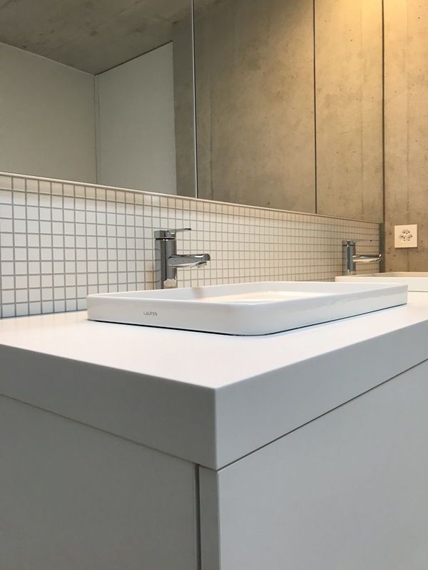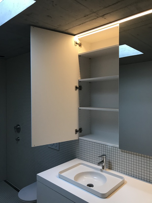 Réalisation de meubles de salle de bains avec la gestion des miroirs collés sur les faces ouvrantes Plan de travail en HI-MACS Alpine White 28 et éclairage également fourni par nos soins Lavabos Laufen Mitigeurs Keuco