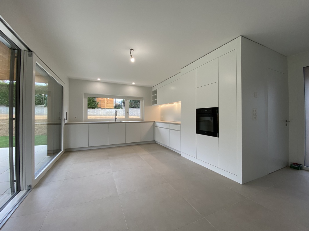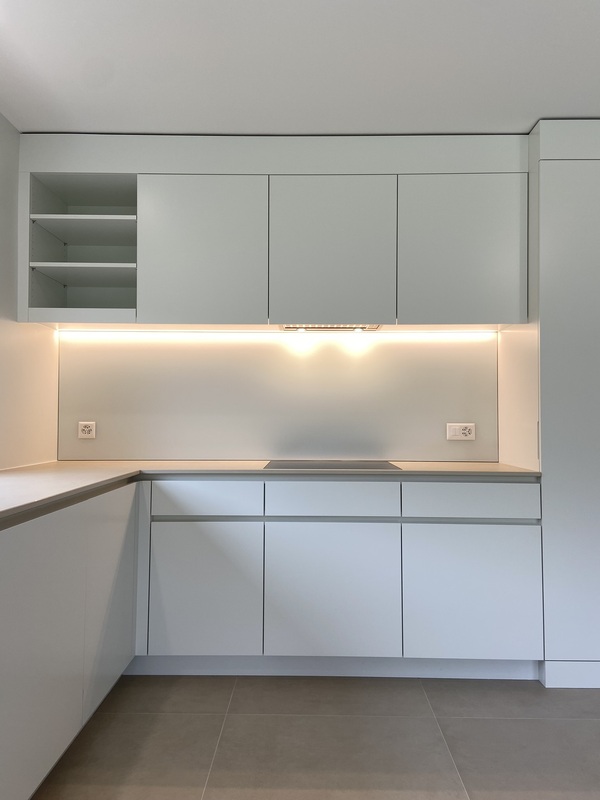 Fabrication et pose d’une nouvelle cuisine laquée – Faces laquées RAL 9016 mattes – Plan de travail en Dekton Natural Sasea 20mm – Plan de cuisson affleuré – Évier depuis dessous