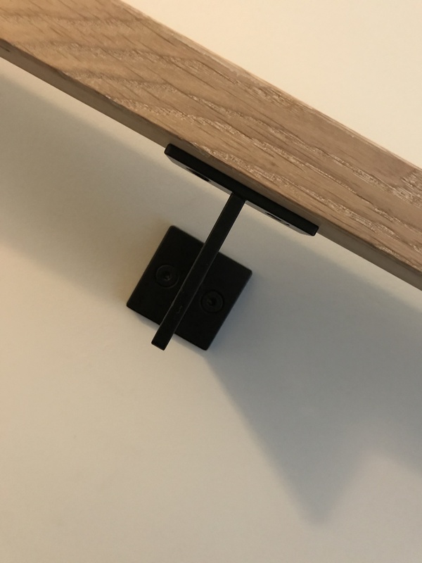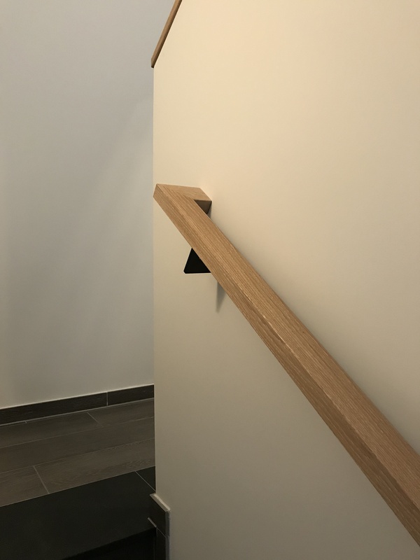 Fabrication et pose d’une main-courante épurée en chêne huilé Les supports ont été faits sur mesure et thermolaqués noir mat