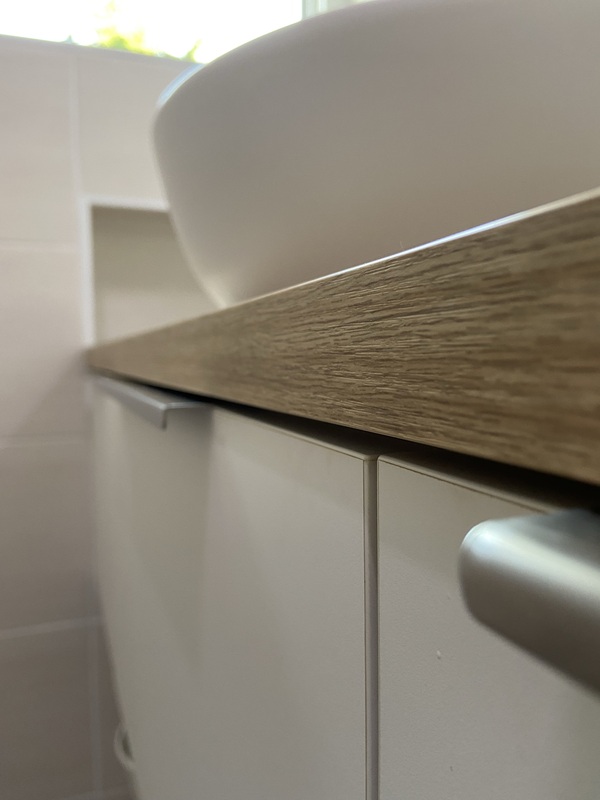 Fabrication et installation de meubles de salle de bains en mélaminé blanc, décor Swisskrono U570 VL Le plan de travail est quant à lui en stratifié (HPL), décor bois Swisskrono D4428 OV.