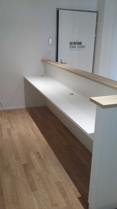 Aménagement d’un cabinet de physiothérapie – Meuble de réception blanc, tablettes et niches en stratifié décor chêne Fundermax 290 NA – Séparation à claires-voie (claustra) en chêne massif – Armoire murale avec casiers à linge
