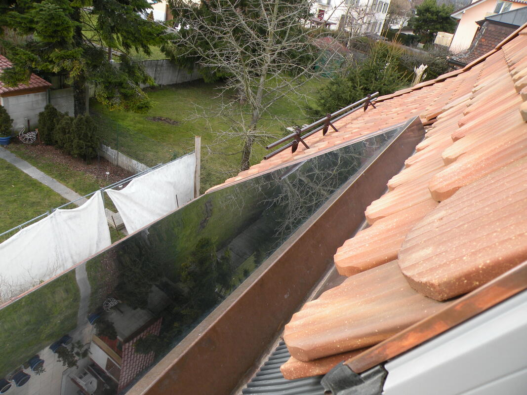 La toiture de cette villa de style est réalisée intégralement en ossature bois. La couverture est réalisée en tuile plate coupe ronde 17/39cm (Gasser Ceramic) nuancé rouge. Les ferblanteries en cuivre et revêtements toit plats sont réalisés par nos soins. Le choix des fenêtres de toiture s’est porté sur des fenêtres à rotation Velux manuelles avec stores intérieurs Velux.